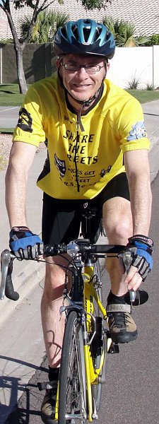 Ed is the Coalition's Webmaster. Ed has been riding primarily for transportation, and to enjoy the health benefits, from his home in the Ahwatukee area of Phoenix on a daily basis for over 10 years. Ed also enjoys recreational MTB riding on the many trails of nearby South Mountain Park, the "largest urban park in the United States". A twenty-year computer industry veteran, Ed handles the Coalition's website and technology needs, and also writes a personal blog at azbikelaw.org, covering transportation safety, justice, engineering and other issues, as well as monitoring legal issues of particular interest to Arizona's bicyclists. Ed was named the Coalition's "Volunteer of the year" in 2009, and currently is serving on the Board of Directors. | ![]() |
