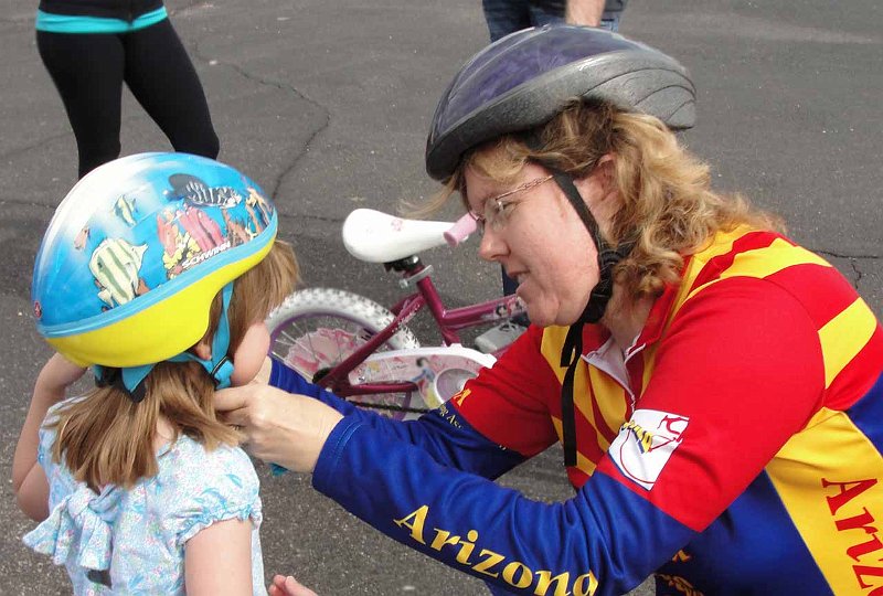 LCI Kathy Mills checks helmet fit. BikeEd for pre-schoolers: Horizon Presbyterian Church (Ahwatukee Foothills), Phoenix