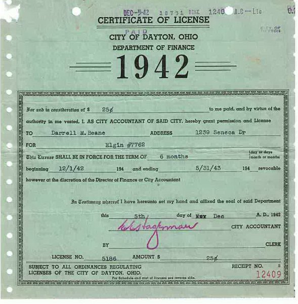 Bicycling in my family goes back a long way…not sure how long. But, I was going through some old family documents today and found my Dad’s 1942 bicycle license (Dayton, Ohio…home of the Wright Brothers, who were bicycle shop owners before creating the first manned flight). His note to me when he sent me this years ago was that he had a red and white Elgin because they could not afford a Schwinn, which would have been nearly $50.00. Pretty cool, I think. --Bob Beane | ![]() |