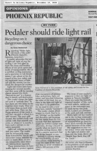 The irony of this argument is that our L-R system is “Bicycle Friendly”. There are twice the Federally required number of bike racks on each vehicle. Additional space in the entryways may be used during non-peak hours. Lockers are provided at the park-and-ride stations. Metro Light-Rail has reached out to the cycling community recognizing that these modes of transportation go hand-in-hand. Each extends the destination horizons of the other.