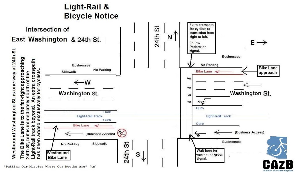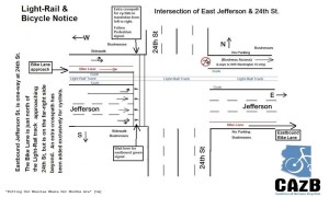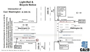 Use of shared lane markings, while established in some localities, have the same “unfamiliarity” factor as bike boxes in Arizona. Use of either will require education and compliance by cyclists and motorists alike. Trying shared lane markings in an area that was specifically designed for speedy high-volume motor traffic would harm more than help. Further, ARS 28-735 exempts motor vehicle drivers from the penalties when an injury occurs where there is a nearby bike lane. That would not be good. I don’t want the introduction of shared lanes to occur in such a motorist-favored area as Jefferson St. between 7th St. and 24th St. I believe we do not want to force good, but less trained cyclists to abandon a good place to ride, namely the business access/bike lanes on the left sides of the tracks. These people will be dis-enfranchised rather than ride in the “slot-car” lanes where the shared-lane markings would be.