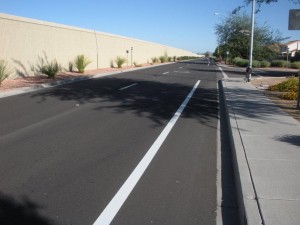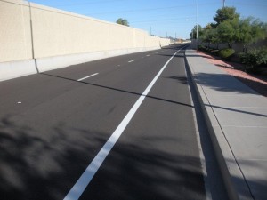 Due to the involvement of the CAzB and a number of other concerned individuals, ADOT was persuaded to re-stripe the Price/Hwy101 frontage roads with edgelines to reconstitute the “bike lanes” (striped but not marked as bicycle lanes) that were previously marked prior to the recent re-paving project. Many bicyclists who live and ride in the area weighed in on this…which illustrates the value of the bicycling community coming together to create a strong, unified voice.