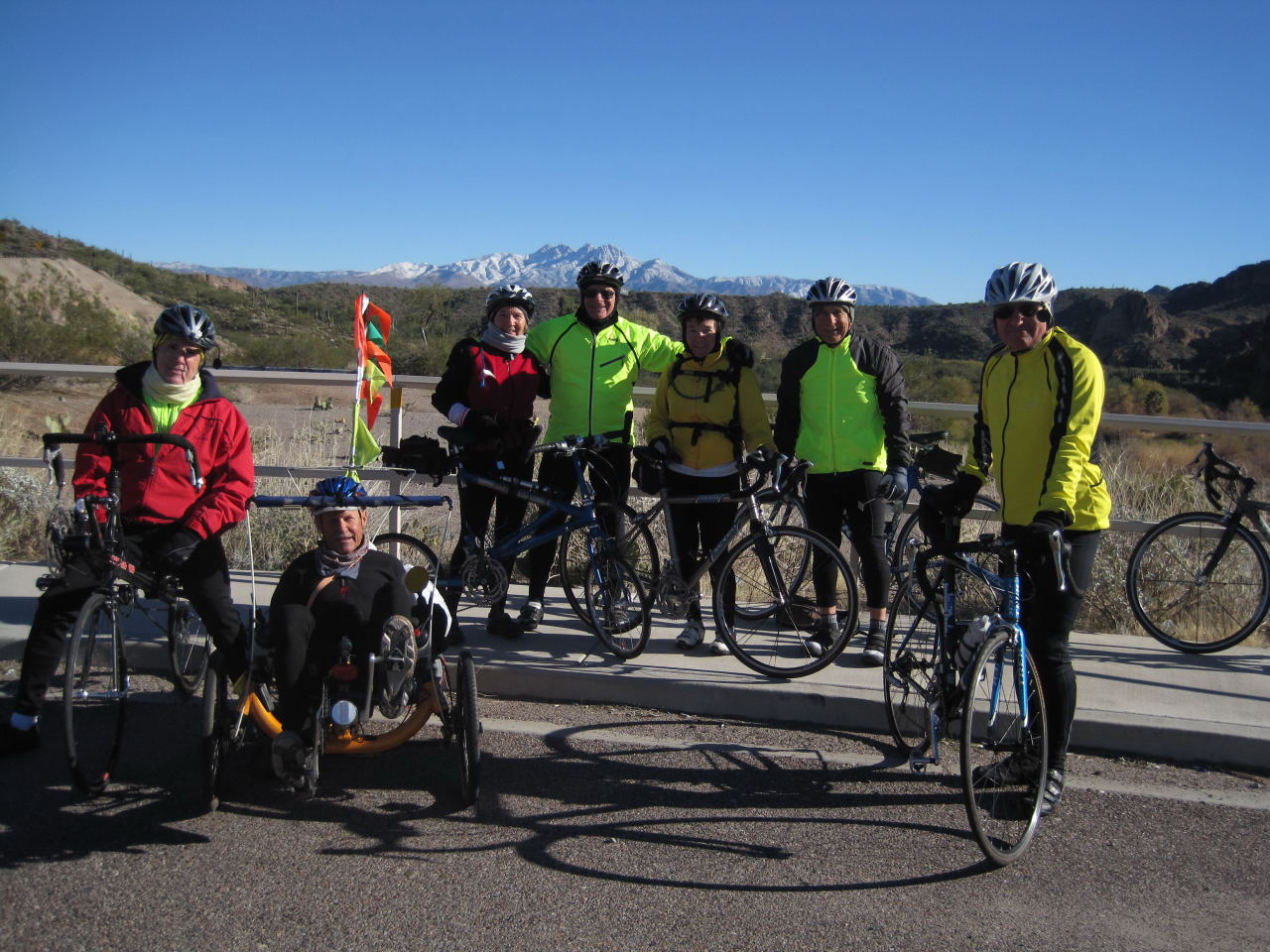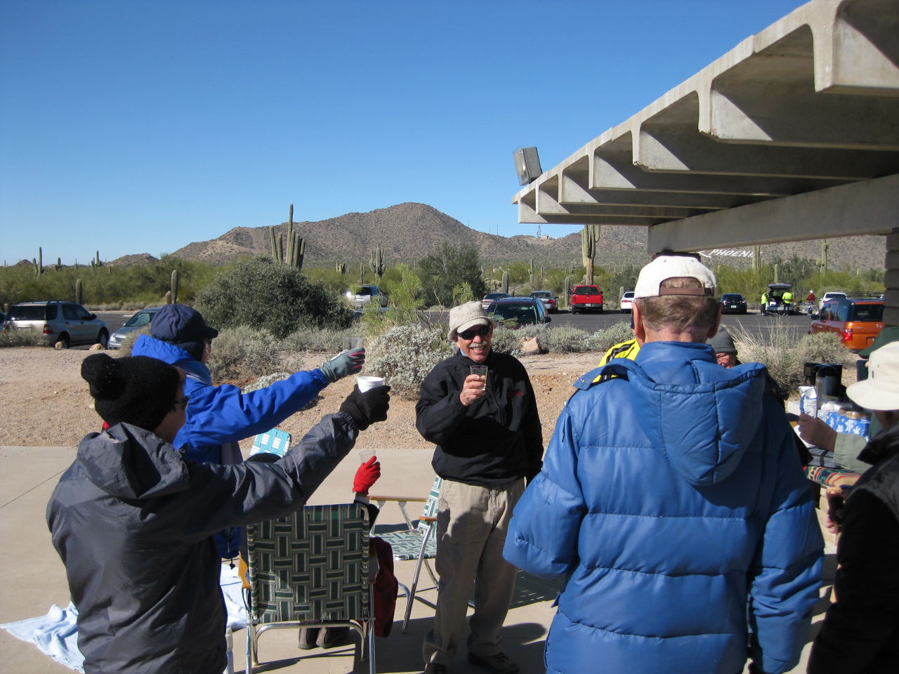 When I arrived at the Usery Mountain Regional  Park for the 2015 version of the New Years Day Pinnacle Peak Peddlers potluck at 9:00 A.M. the thermometer registered 34º. When I left at 1:15 P.M., the thermometer showed 42º. What transpired in that 8º window?