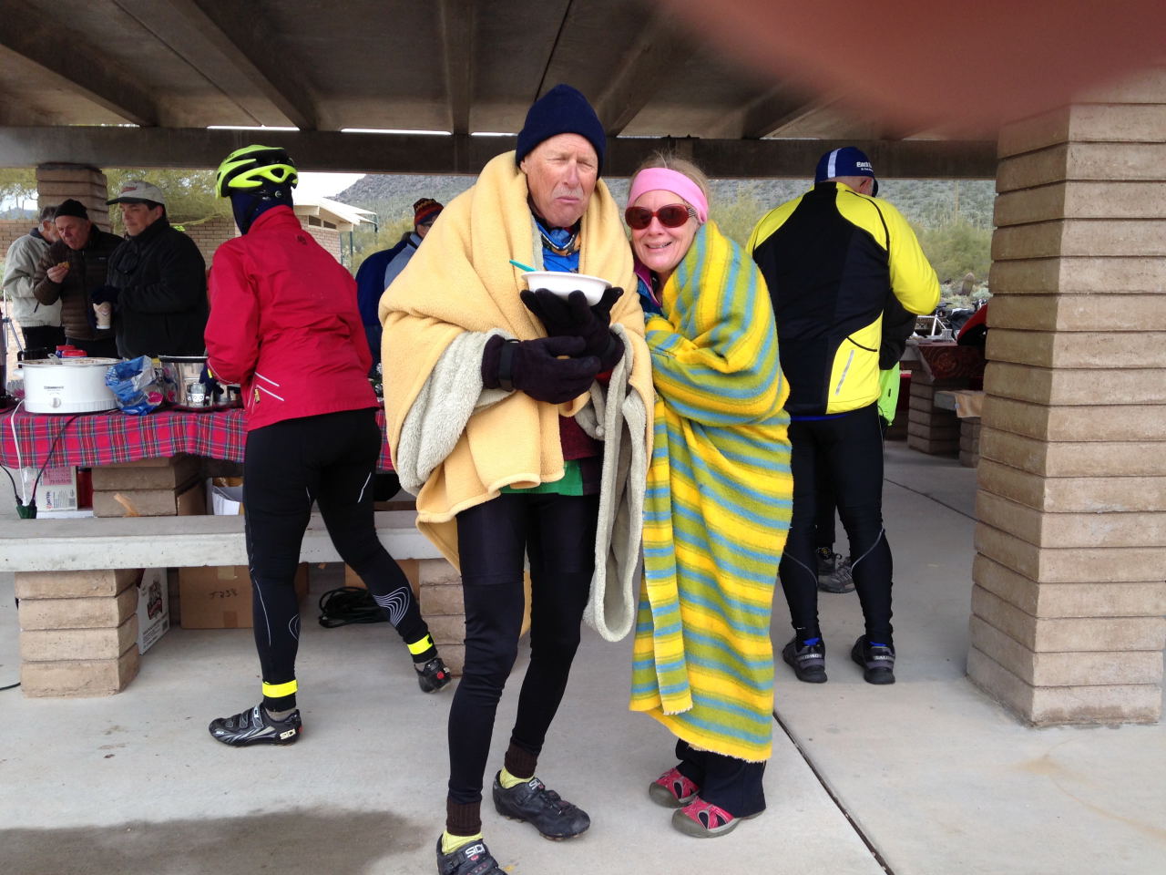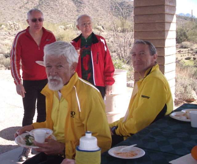 As Waltʼs group returned and cyclists biked in from Sun Lakes and Tempe, the socializing began in earnest. No one had to be called twice for food–hearty chili and other nourishing hot food.